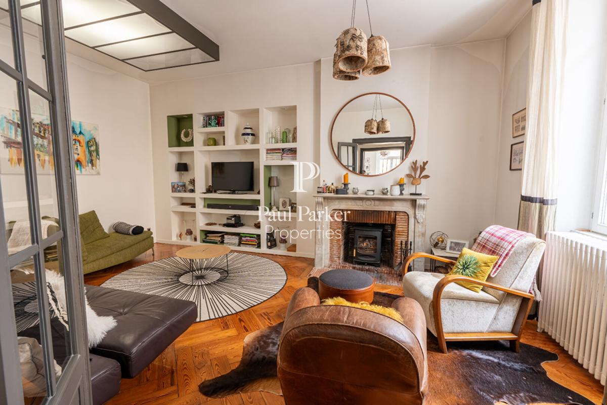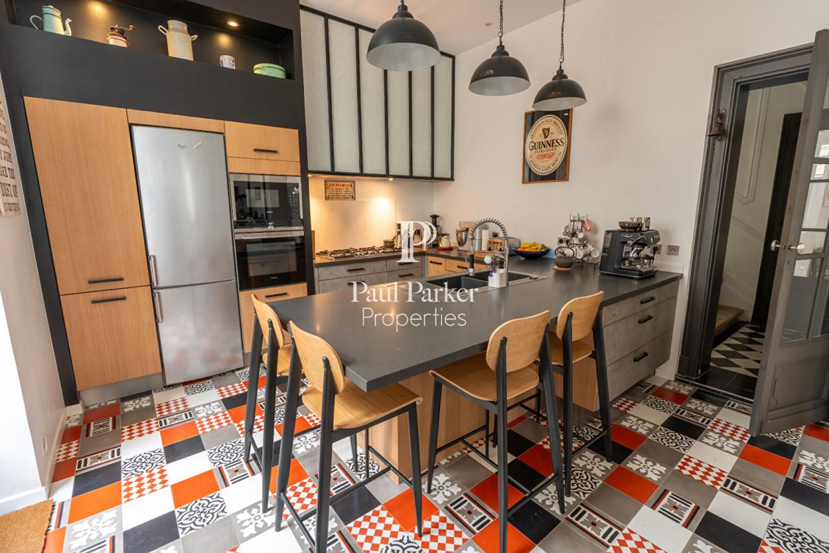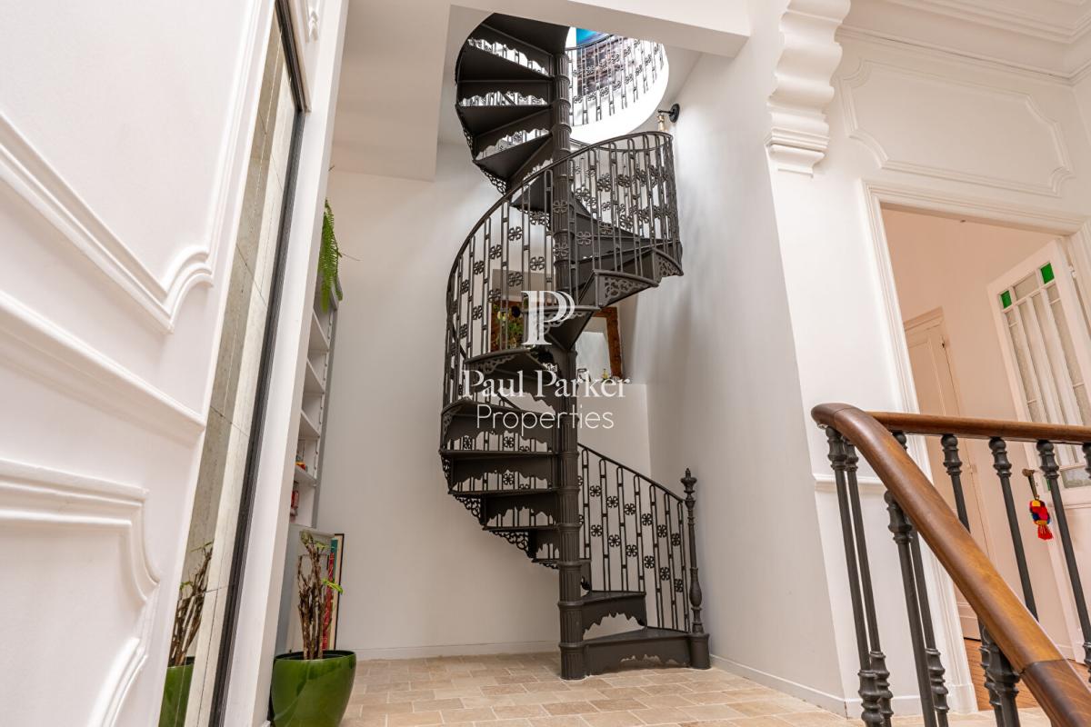 La maison principale développe environ 200 m² avec quatre belles suites, dont une sous les toits avec son espace bureau et salle de bain privée. Elle est desservie par un remarquable escalier en colimaçon en fonte, de style Eiffel et d’origine. Les éléments anciens tels que carreaux de ciment, moulures, radiateurs en fonte et hauteur sous plafond sont soigneusement préservés, associés à des prestations modernes : double vitrage, alarme, réseau RJ45, cuisine Pérenne, porte blindée et toiture entièrement refaite en 2024. La maison dispose également d’une buanderie et de deux grands sous-sols aménageables.