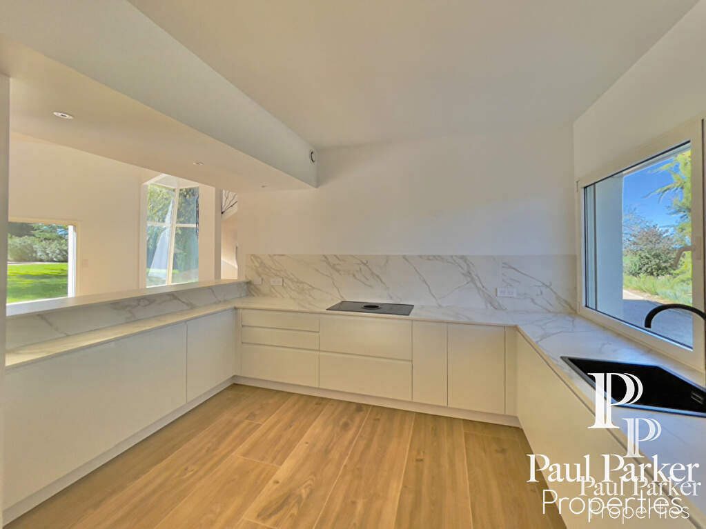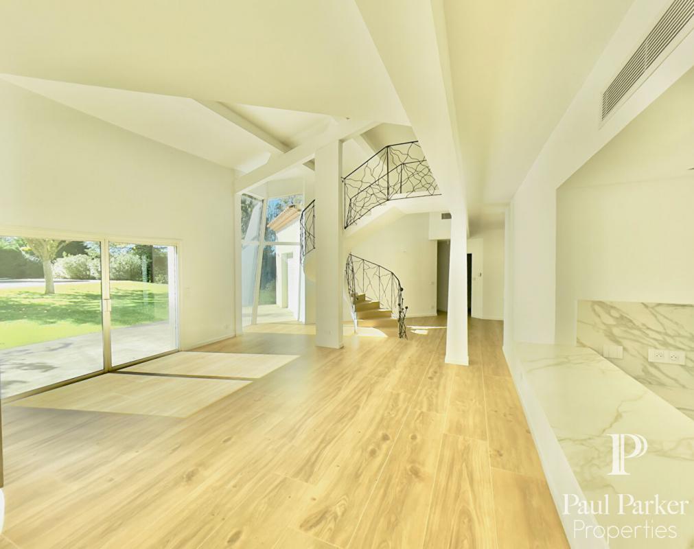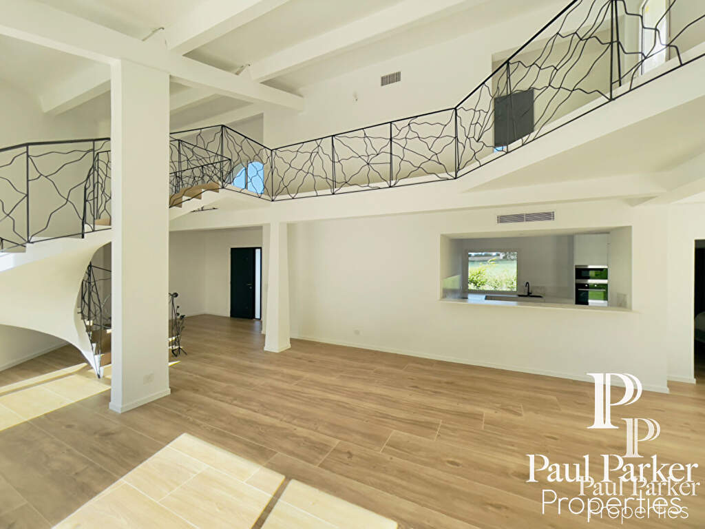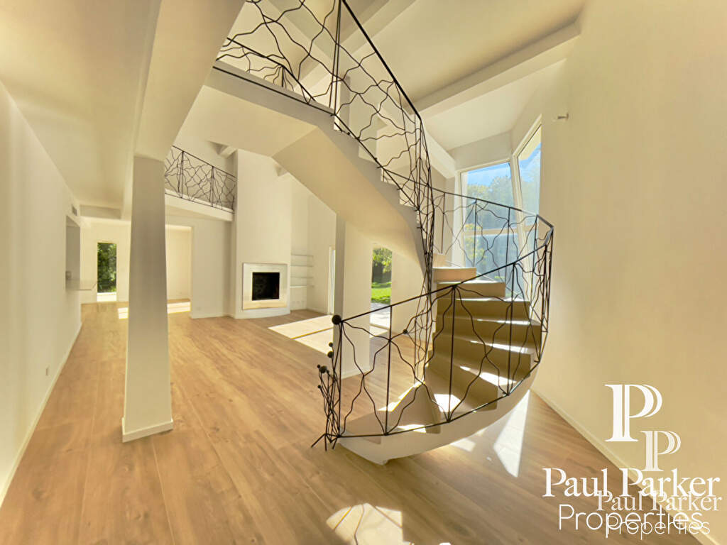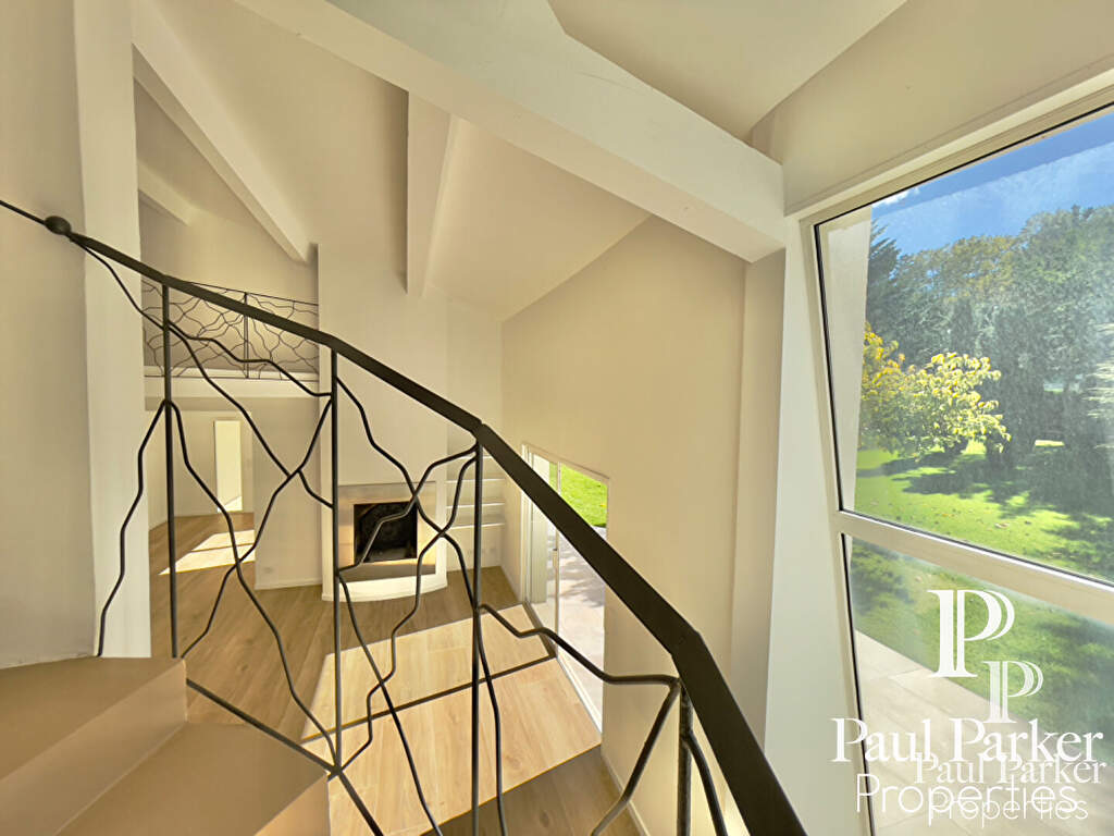 La propriété a été entièrement rénovée récemment, l’architecture intérieure est remarquable et l’ensemble de l’espace principal est vaste et traversant. Le plan est judicieusement pensé et ordonnancé, disposant d’un hall d’accueil avec dressing séparé, on perçoit l’ensemble de la pièce à vivre en perspective sur salon et salle à manger s’ouvrant sur une terrasse au sud. Un escalier sculptural en courbes et volutes, dessine et anime l’espace de vie, il dessert l’étage de nuit. Couplé à une verrière forme fractale sur jardin au sud. De très hauts volumes sous charpente peinte craie blanche, une cheminée insert habillage aluminium cubique. Le rdc dispose de 3 chambres master très lumineuses sur l’aile nuit à l’ouest comprenant 1 Sdb, 2 salles d’eau et dressing.