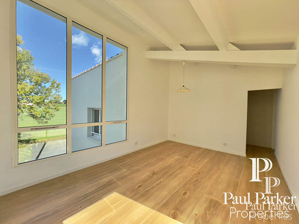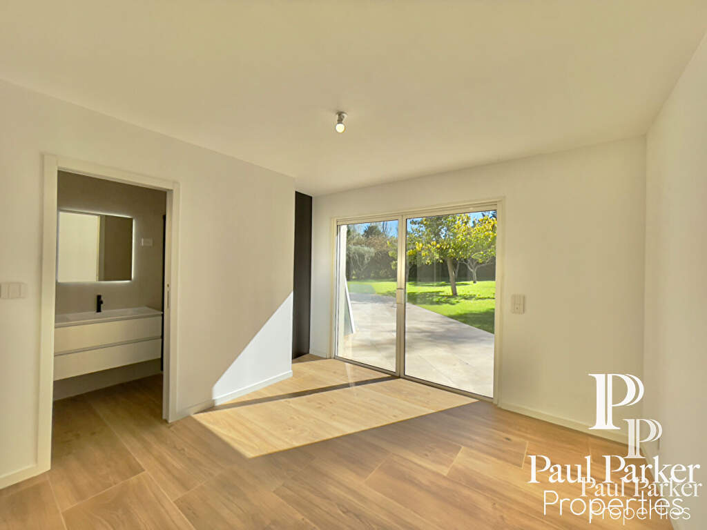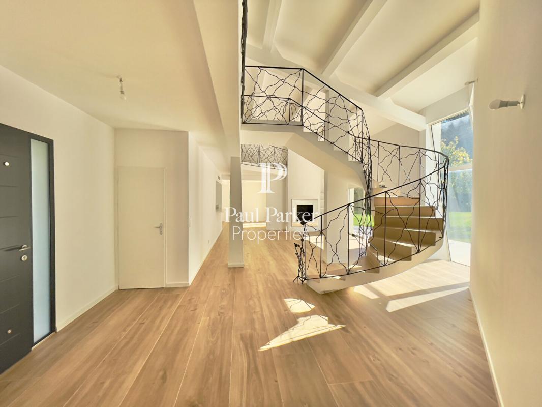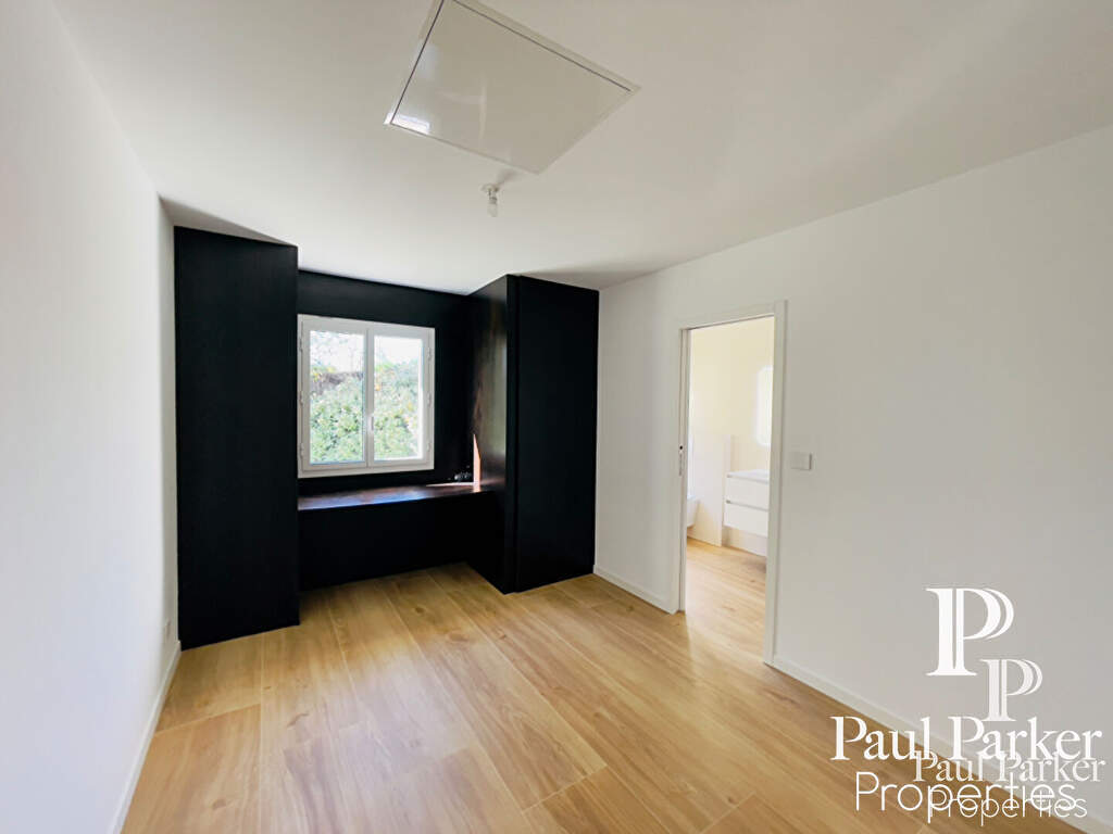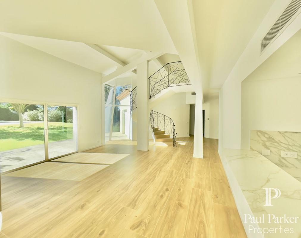 La propriété a été entièrement rénovée récemment, l’architecture intérieure est remarquable et l’ensemble de l’espace principal est vaste et traversant. Le plan est judicieusement pensé et ordonnancé, disposant d’un hall d’accueil avec dressing séparé, on perçoit l’ensemble de la pièce à vivre en perspective sur salon et salle à manger s’ouvrant sur une terrasse au sud. Un escalier sculptural en courbes et volutes, dessine et anime l’espace de vie, il dessert l’étage de nuit. Couplé à une verrière forme fractale sur jardin au sud. De très hauts volumes sous charpente peinte craie blanche, une cheminée insert habillage aluminium cubique. Le rdc dispose de 3 chambres master très lumineuses sur l’aile nuit à l’ouest comprenant 1 Sdb, 2 salles d’eau et dressing.