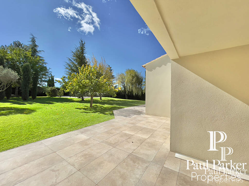 Villa post moderne rénovée, pour villégiature familiale, au nord d’Aix en Provence, 12 min parking Pasteur Archevêché. 248 m2 surface habitable architecture contemporaine 6 chambres (3 en rdc) 2 Sdb + 3 Sde / dont 1 studio indépendant / 4225 m2 parc paysager somptueux. Piscine forme libre + garage X 2 + parking extérieur, desserte scolaire.