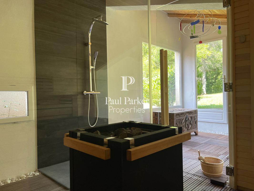 A l’extérieur, la propriété se distingue par une piscine chauffée au sel, entièrement rénovée, et par un magnifique parc paysager d’environ 8 000 m². Arbres fruitiers, terrasses, grands arbres et accès direct au cours d’eau composent un décor idyllique et rare, renforcé par les droits d’eau privatifs.