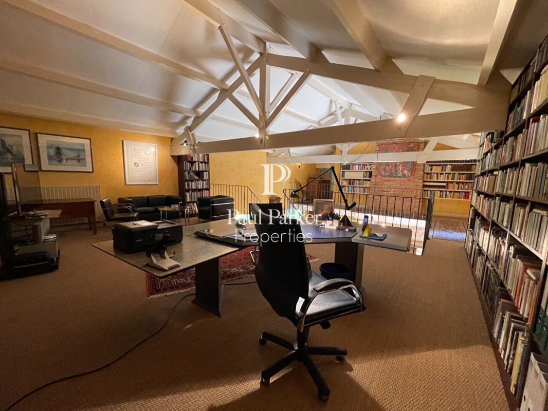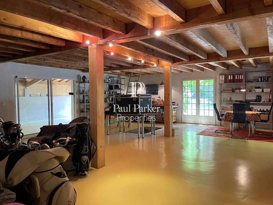 Le rez-de-chaussée s’ouvre sur une vaste entrée de 29 m² avec sol en travertin, vestiaire et élégant escalier hélicoïdal. La cuisine de 22 m², entièrement équipée avec des appareils de grande qualité, est complétée par une buanderie et une lingerie attenantes. Le coeur de la maison est sans conteste l’impressionnant séjour de 88 m², avec grande cheminée ouverte, espace salon en contrebas et vues apaisantes sur le bief du moulin et le jardin ? un lieu de vie spectaculaire et empreint de sérénité.