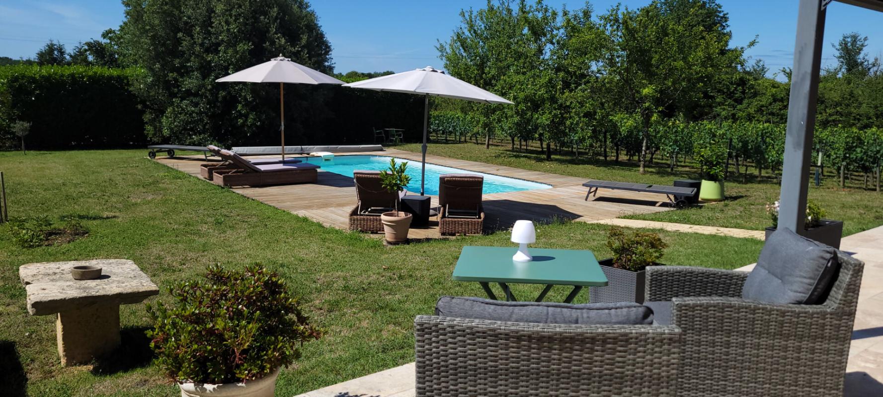 Sur un terrain de 5 000m2, la propriété dispose d’une vaste terrasse avec cuisine d’été, d’une piscine au chlore de 8 X 4 m, de ‘400m2 de pieds de vigne en fermage qui contribuent à l’élégance du décor et d’arbres fruitiers.