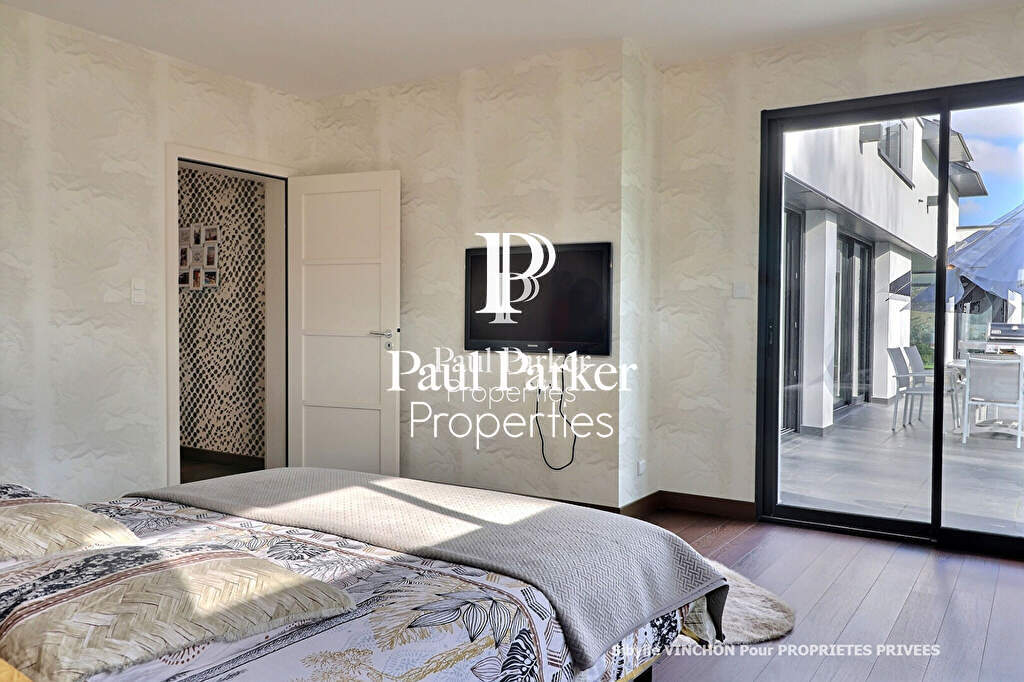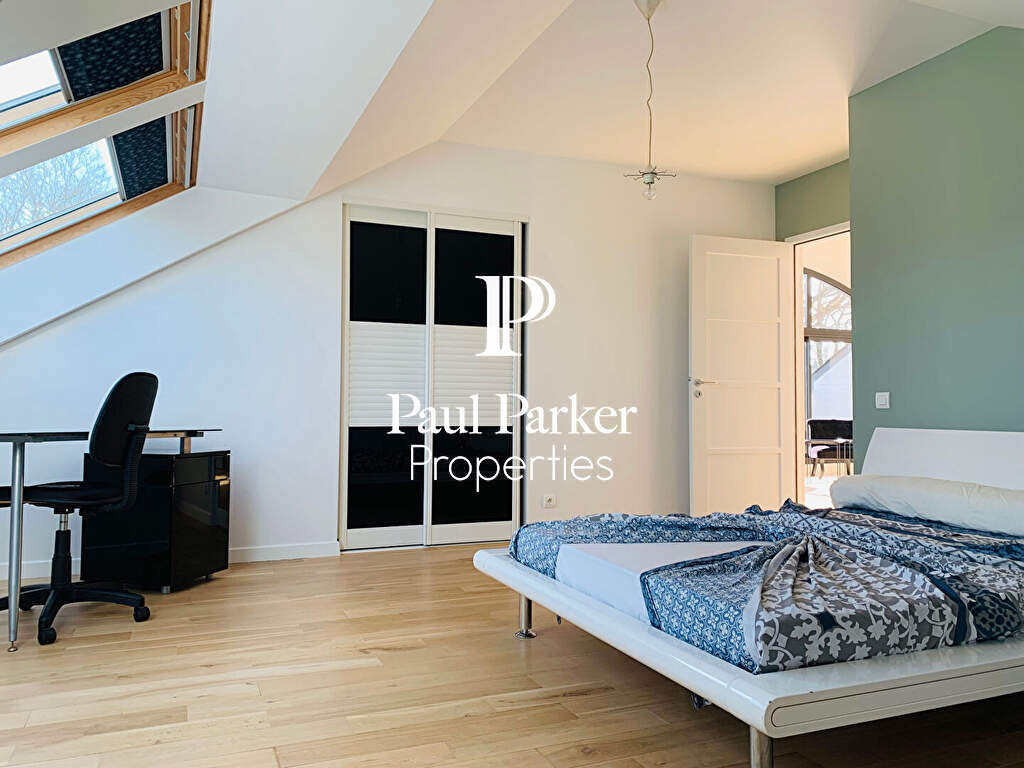 Au rez-de-chaussée, la suite parentale offre une véritable bulle d’intimité : chambre spacieuse avec vue sur le jardin, salle d’eau élégante, toilettes privées, dressing sur mesure et bureau attenant. Tout est pensé pour le confort et la sérénité.
