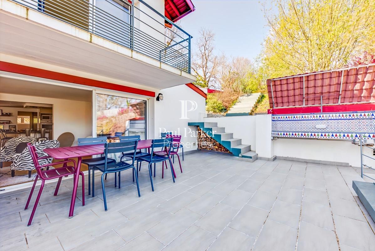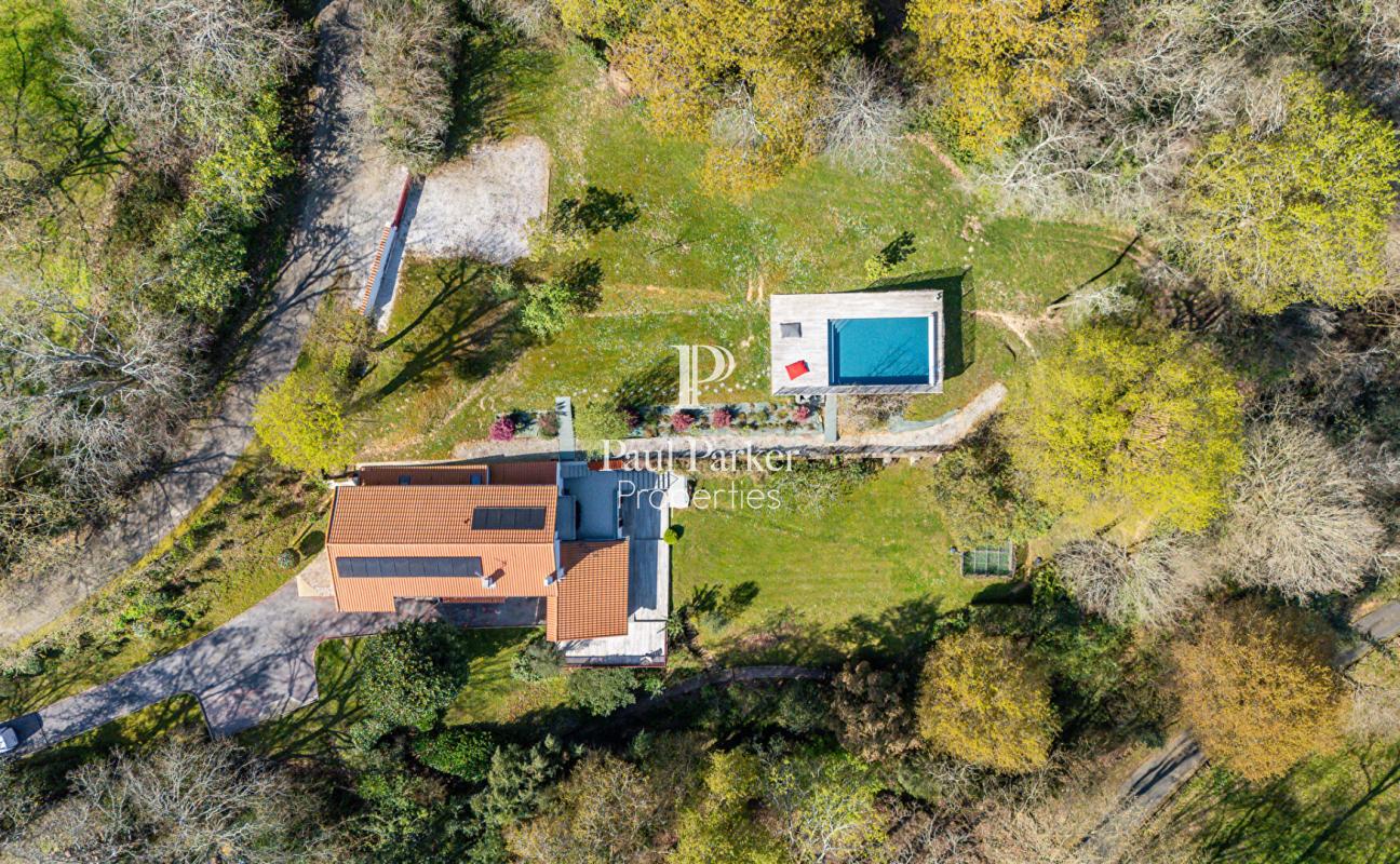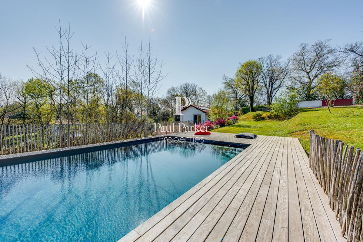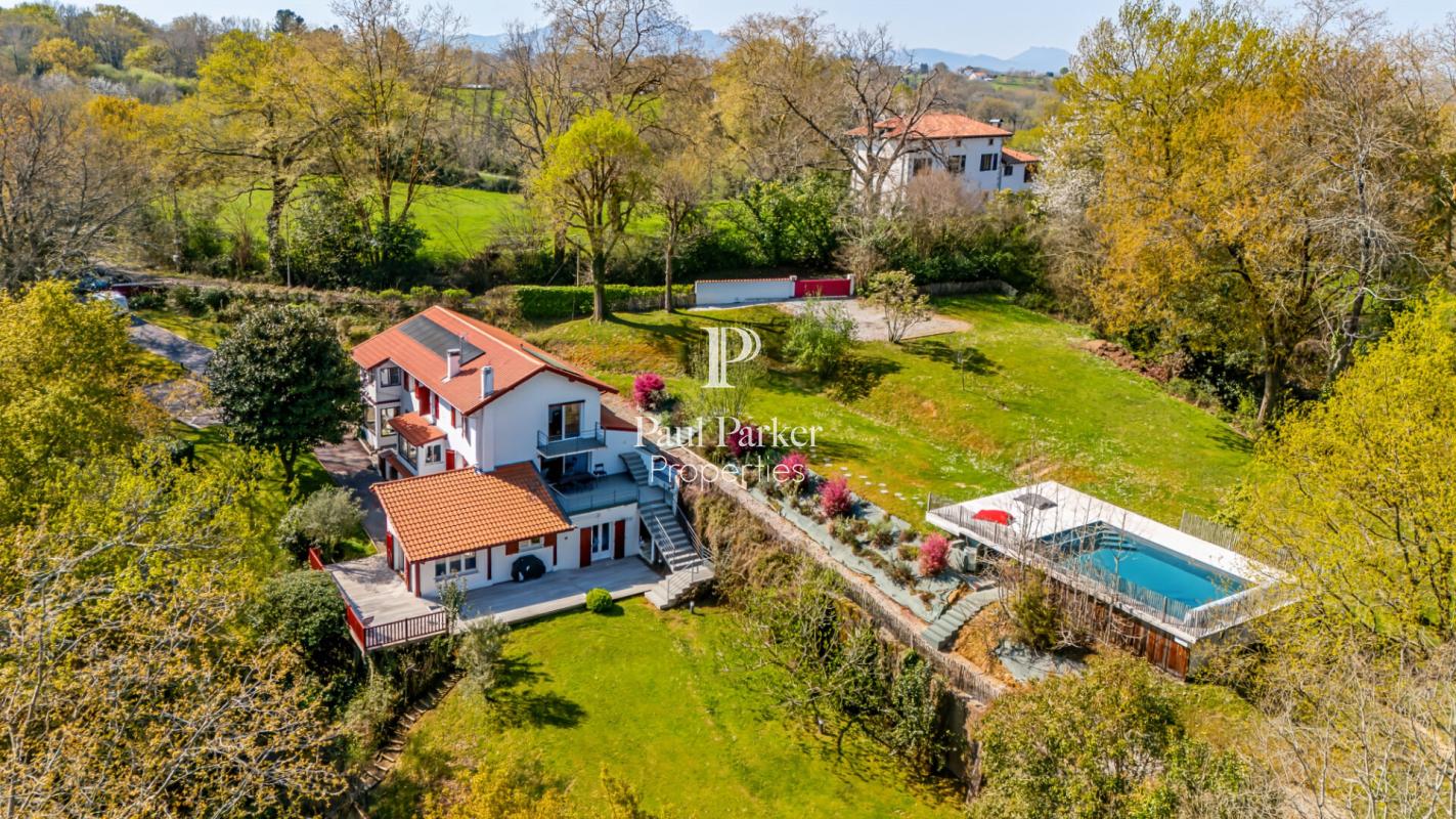 Discover this magnificent villa, a perfect blend of neo-Basque charm and clean, modern architecture. Nestled in lush greenery, it offers an exceptional living environment just minutes from the golf courses and beaches of the Basque Coast. From the moment you enter, the tone is set by a vast, light-filled living space, with a fully equipped kitchen that flows seamlessly into the living room, which opens directly onto a superb terrace. A true invitation to conviviality, this outdoor space features a plancha grill, ideal for entertaining loved ones in a verdant setting with unobstructed views. The sleeping quarters are located upstairs, with four bedrooms, including a master suite complete with a dressing room and bathroom. The ingenuity of its design is evident in its fluidity: a sculptural concrete staircase leads to the reinforced concrete, saltwater swimming pool, heated sustainably by solar panels, allowing you to enjoy swimming in complete privacy with optimized energy management. The property also includes an office, a laundry room, a cellar, and a garage for bicycles or scooters. The real highlight of this property is its fully equipped annex, comprising a kitchen, a bedroom, and a bathroom, offering complete independence for your guests or high-quality rental potential. A rare residence, designed for the art of living and sharing. (2.96 % fees incl. VAT at the buyer’s expense.)
