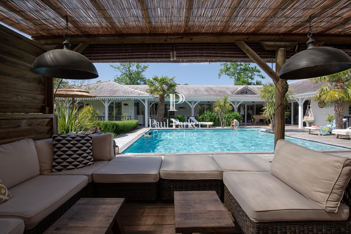 Located near Lac de Lacanau and offering approximately 200 m² of living space, this fully renovated single-storey property features a spacious living room with fireplace, a dining room, and a separate fully equipped kitchen. It also includes 5 bedrooms, each with its own bathroom and separate toilet.